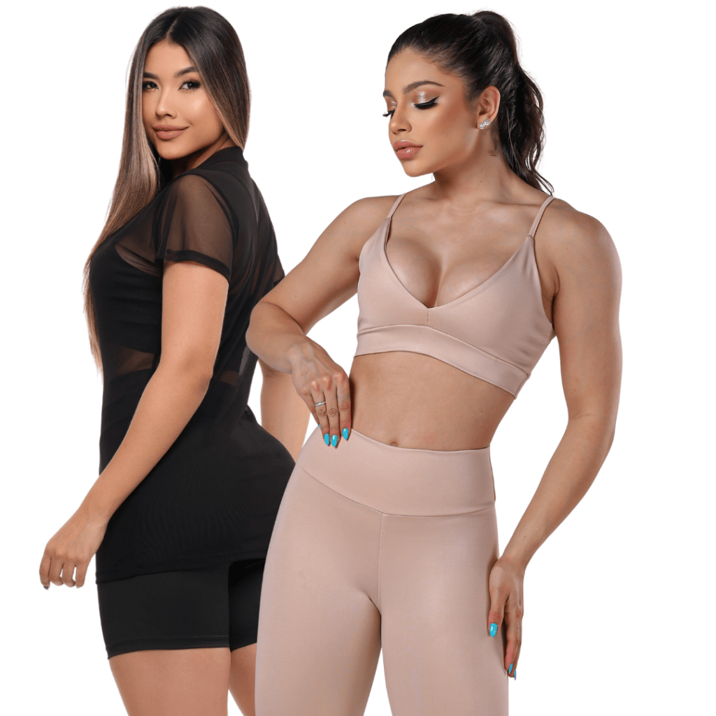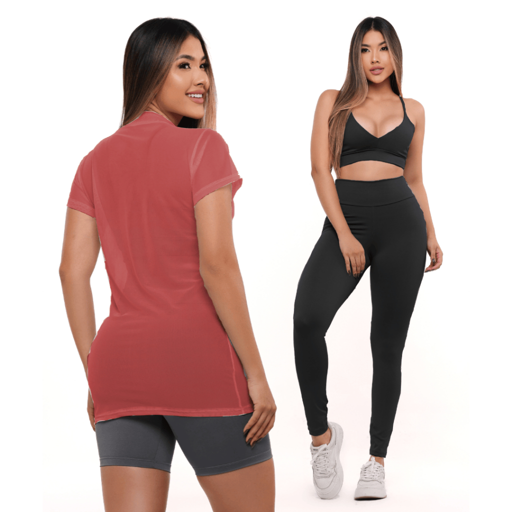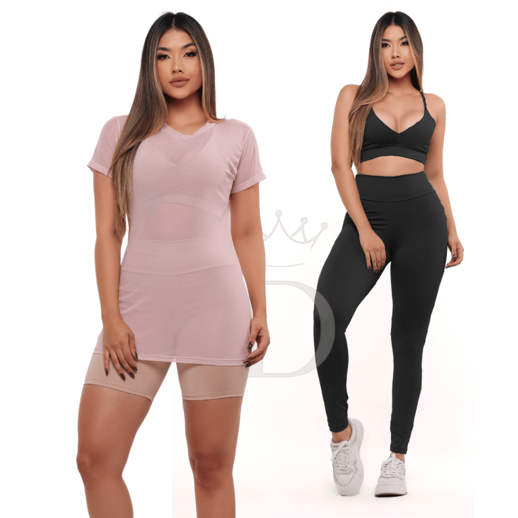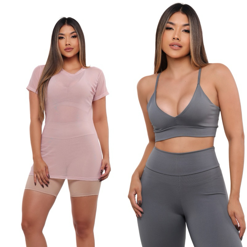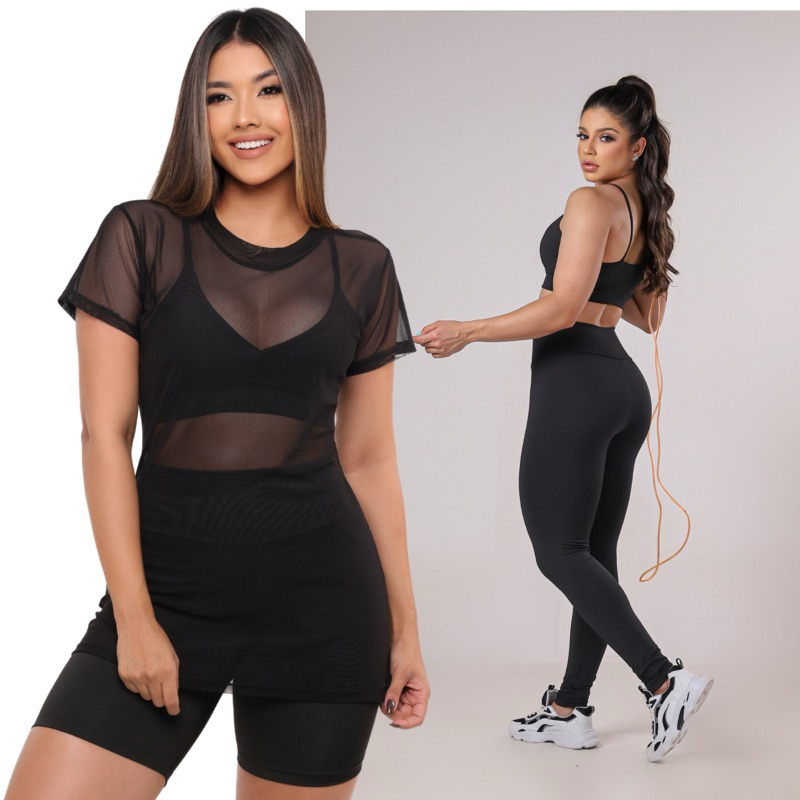 ✅CONJUNTO: TOP + BLUSA DE TULE + CALÇA FITNESS CINTURA ALTA SEM TRANSPARÊNCIA Costura reforçada academia premium brilho Crossfit atacado